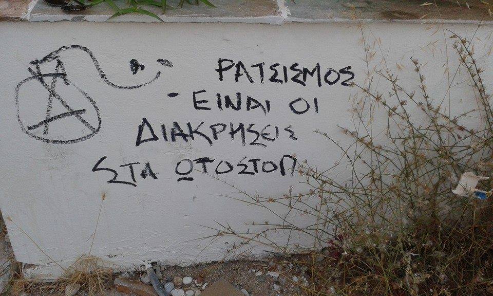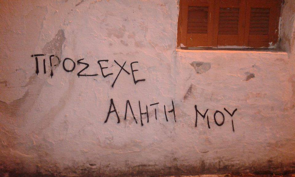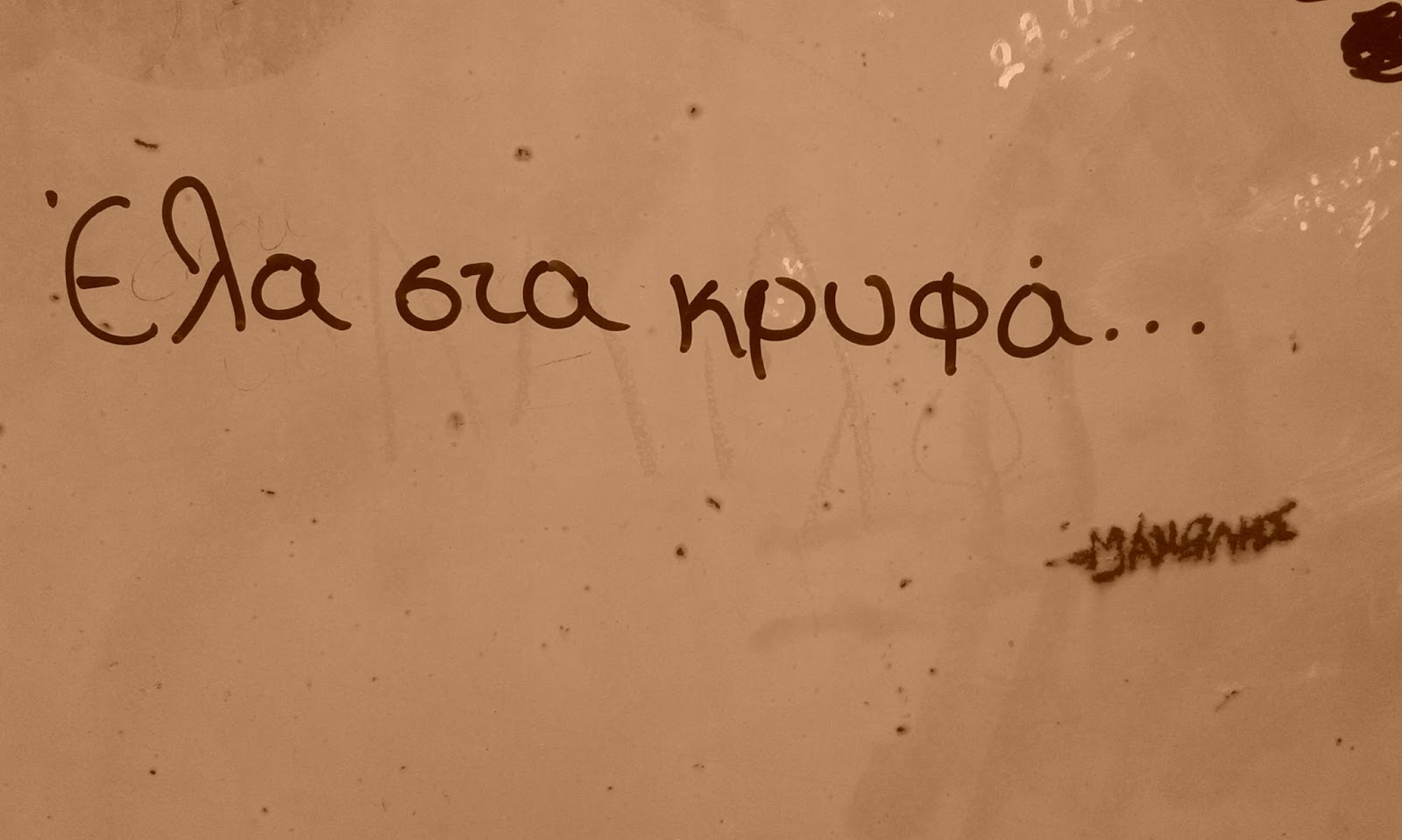 Τα συνθήματα στους τοίχους είναι πινακίδες που αντί να μας υπαγορεύουν πού πρέπει να σταματάμε, πού απαγορεύεται να στρίψουμε ή σε ποιον πρέπει να παραχωρούμε προτεραιότητα, μας δίνουν μια σπρωξιά προς την ακαριαία σκέψη, παίζουν το ρόλο του πρωινού που πρέπει να είναι δυνατό ώστε να αντέξουμε τις δύσκολες ημέρες ή ακόμα ακόμα είναι το καθημερινό συνεχές ξυπνητήρι μας που εμείς που δε γράφουμε, επιτρέψαμε στο σύγχρονο αόρατο στοχαστή να το βάζει κάθε μέρα να χτυπά, μέχρι να αναγκαστούμε να το ακούσουμε και να ξυπνήσουμε. Όχι δεν υπερβάλλω. Η γειτονιά μου είναι ένα ανοιχτό δημόσιο βιβλίο που όταν το πρωί κινώ για τη δουλειά μου κάποιος φροντίζει να μου κάνει παρέα, θυμίζοντάς μου ότι όσο εγώ κοιμάμαι, τα βράδια αυτός εργάζεται ώστε το πρωινό μου να ξεκινάει με ένα κλείσιμο ματιού στη σκέψη μου, μία ηλιαχτίδα ελπίδας στο ρημαγμένο τηλεοπτικό τοπίο που ξέφυγε από το γυαλί και κατέκλυσε με ορμή το αστικό τοπίο. (όλο το κείμενο ΕΔΩ)
